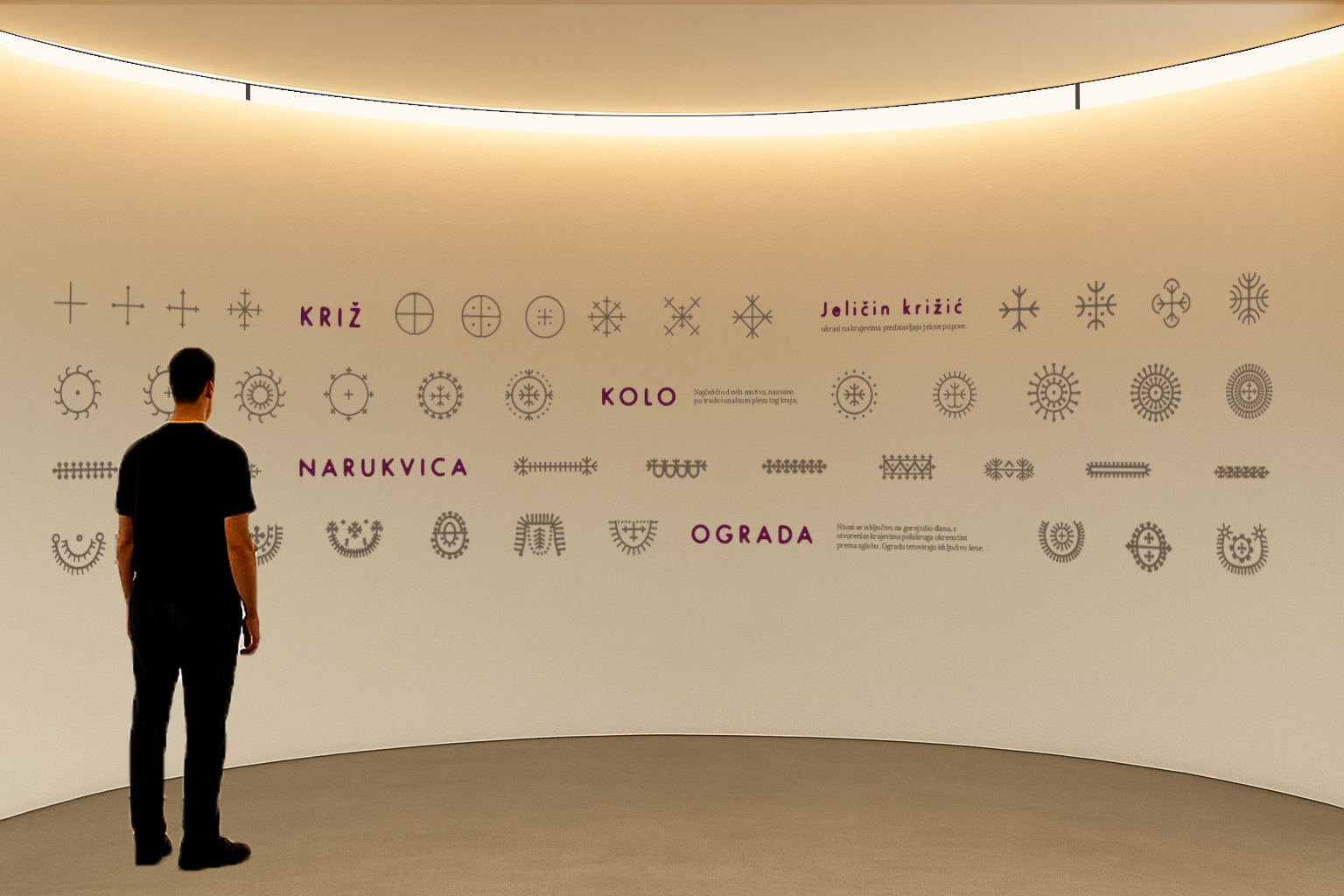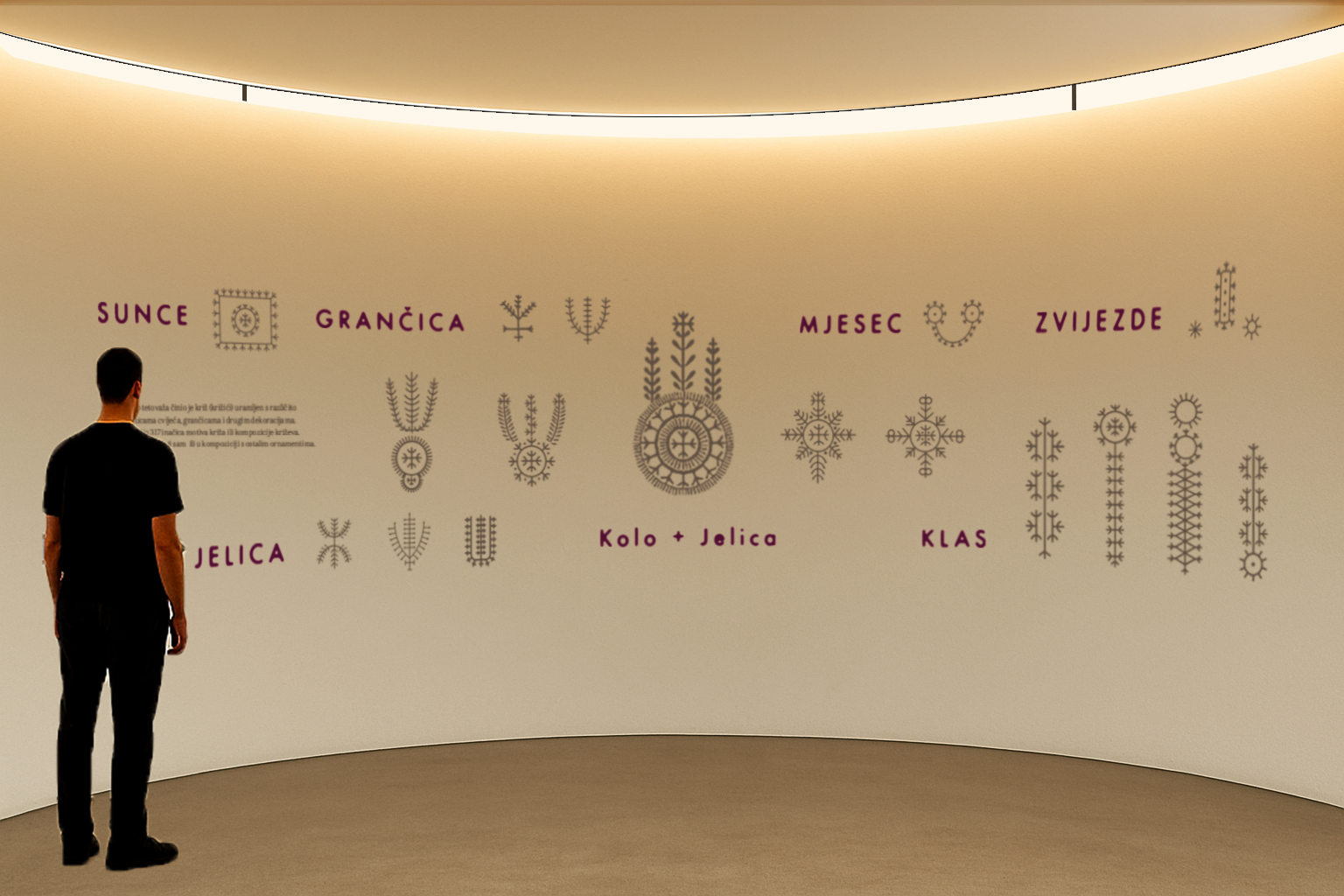Na zidovima su prikazani glavni ornamenti s njihovim nazivima i značenjima. Prostor prati zvuk ritmičkog udaranja stopala u kolu, koji pojačava osjećaj ritualnosti i mistike.