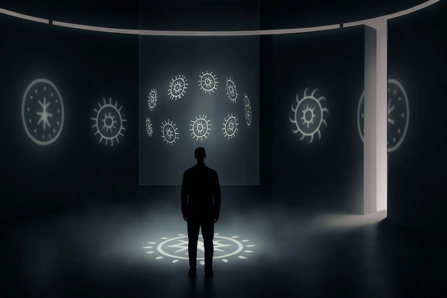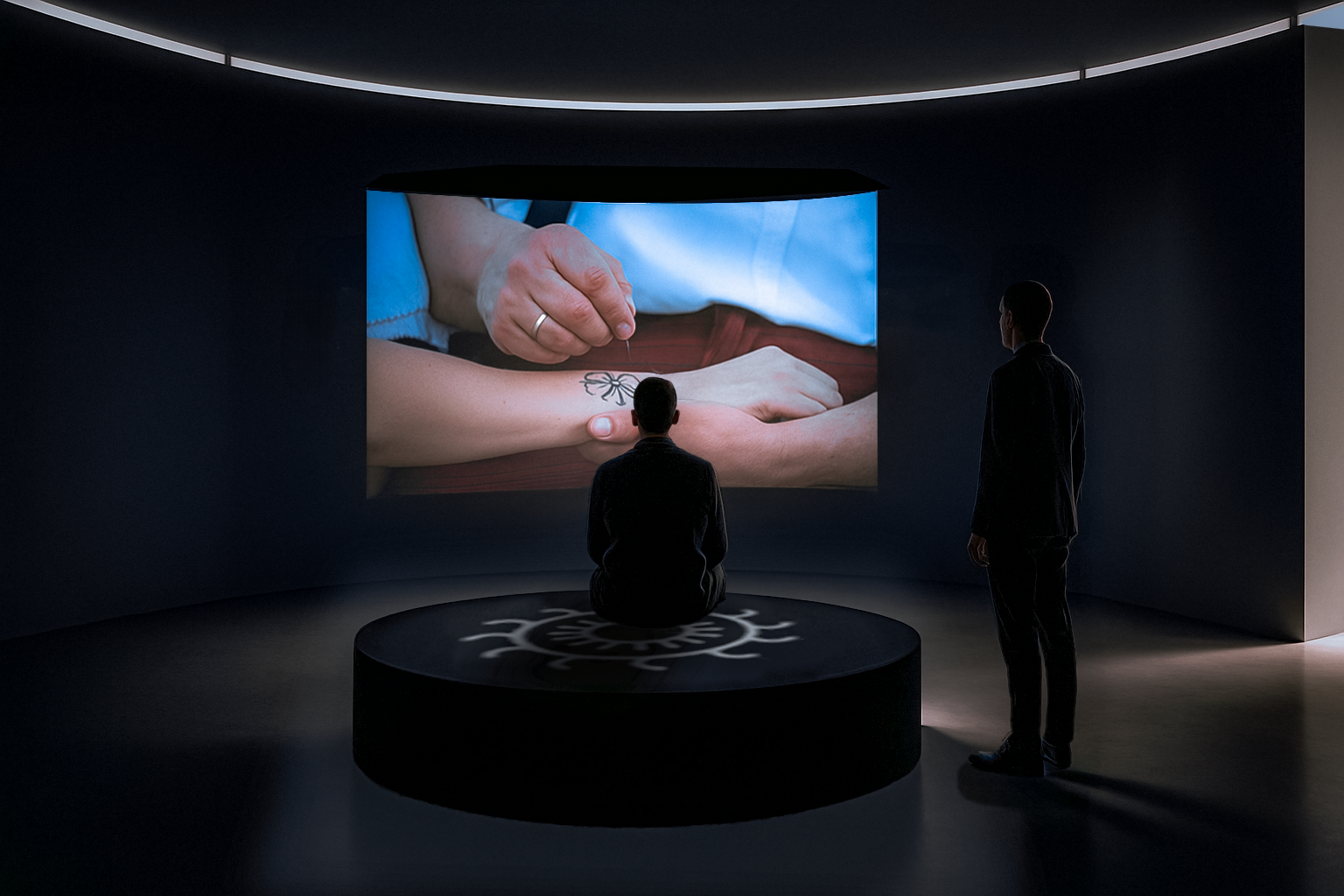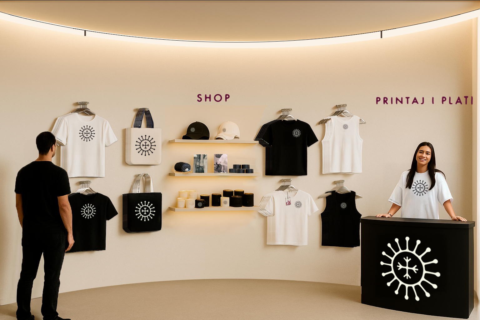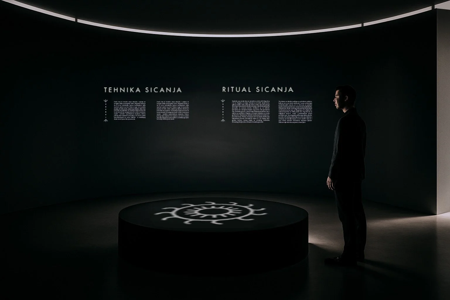 Prostor zamišljen kao ulaz u simbolički svijet sicanja. U središtu se vrti hologram sastavljen od motiva kola i narukvice, dok svjetlosne projekcije pulsiraju u ritmu elekro muzike. Zvuk i blagi sloj dima stvaraju osjećaj misterije.
