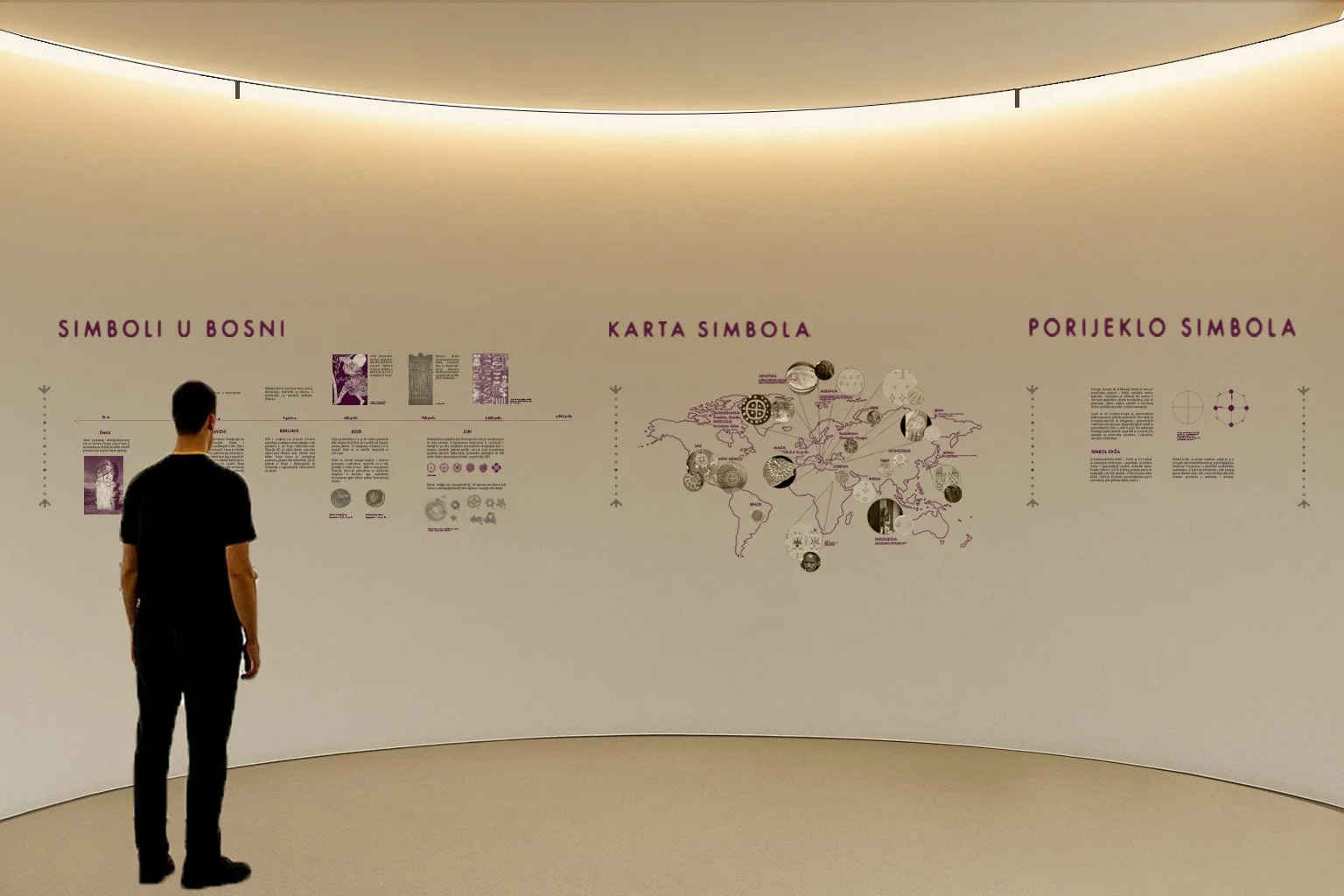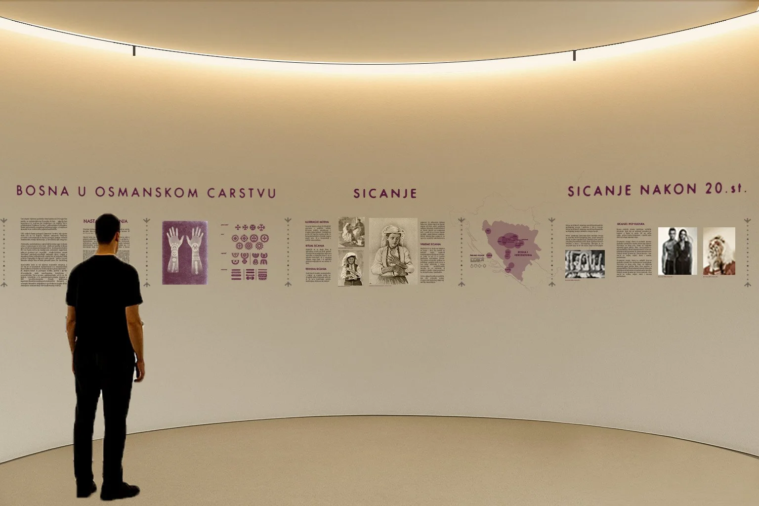 Desni zid prikazuje porijeklo pretkršćanskih motiva te način na koji su se simboli kroz povijest Bosne očuvali, prilagođavali i mijenjali značenja, dok lijevi vodi kroz razvoj same tradicije – od vremena osmanskih osvajanja, preko njezina očuvanja, do današnje prisutnosti u pop kulturi