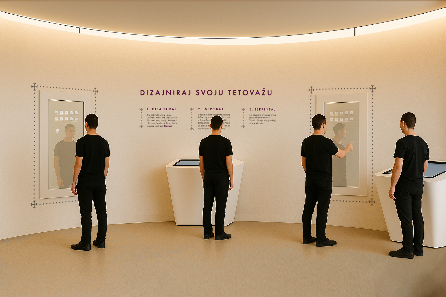 Posjetitelji na pametnim stolovima i interaktivnim ogledalima mogu kreirati i virtualno isprobati vlastite privremene tetovaže te ih kupiti kao personalizirani suvenir. Na suprotnom zidu nalazi se muzejski shop s brendiranim predmetima.
