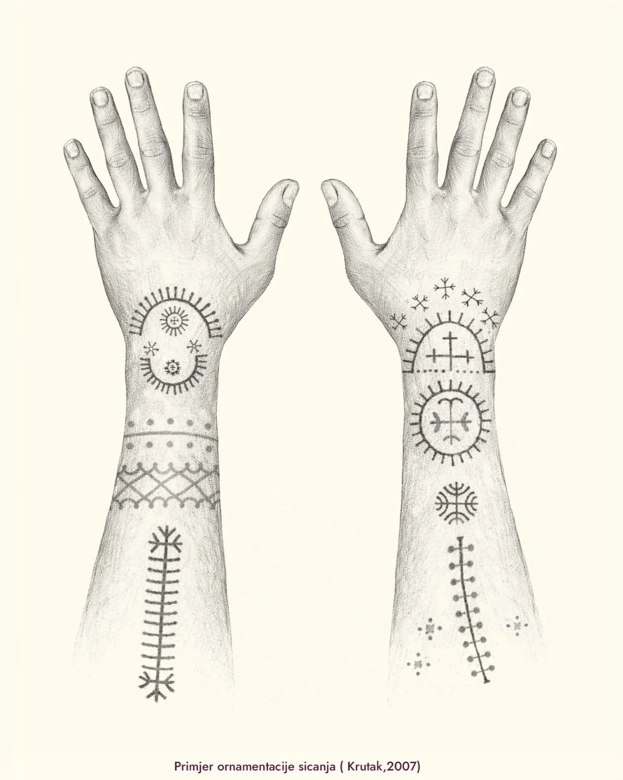 Najčešće su se sicale djevojčice u dobi od 12 do 16 godina, a tetoviranje su obično izvodile starije žene u obitelji. Muškarci su se tetovirali rjeđe i najčešće su nosili jednostavne križeve na rukama ili čelu.